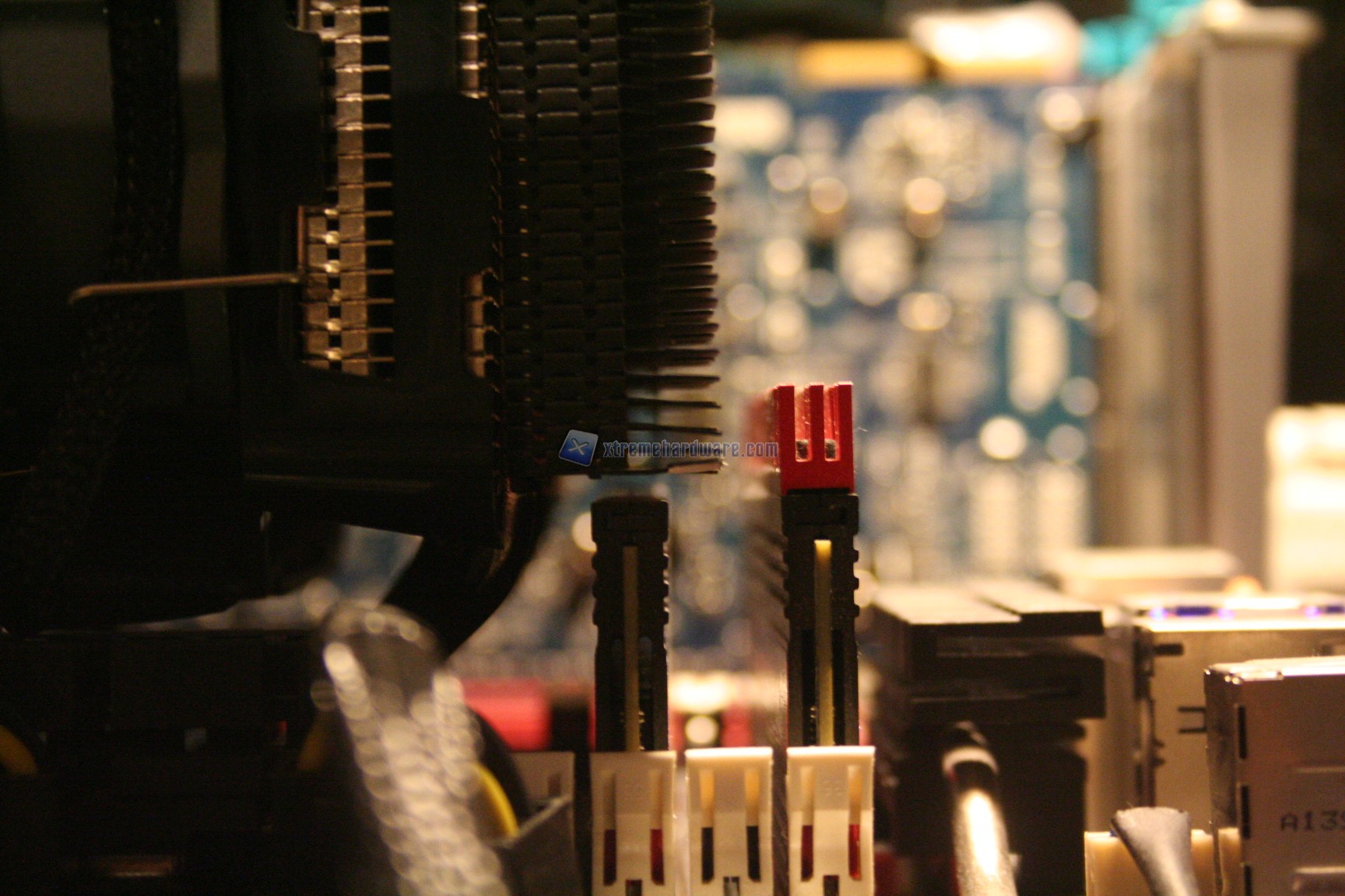 Su una RIVE X79 bisogna rialzare leggermente sia la ventola frontale, sia quella posteriore, perché altrimenti vengono occupati diversi slot di RAM e ciò sarebbe inaccettabile. A conti fatti la configurazione triventola da 140mm è adatta a socket che non siano il 2011, aventi quindi RAM spaziate poste solo frontalmente. Posteriormente infatti la situazione come vedete può essere ancora più problematica, per via della struttura asimmetrica delle due torri dissipanti: