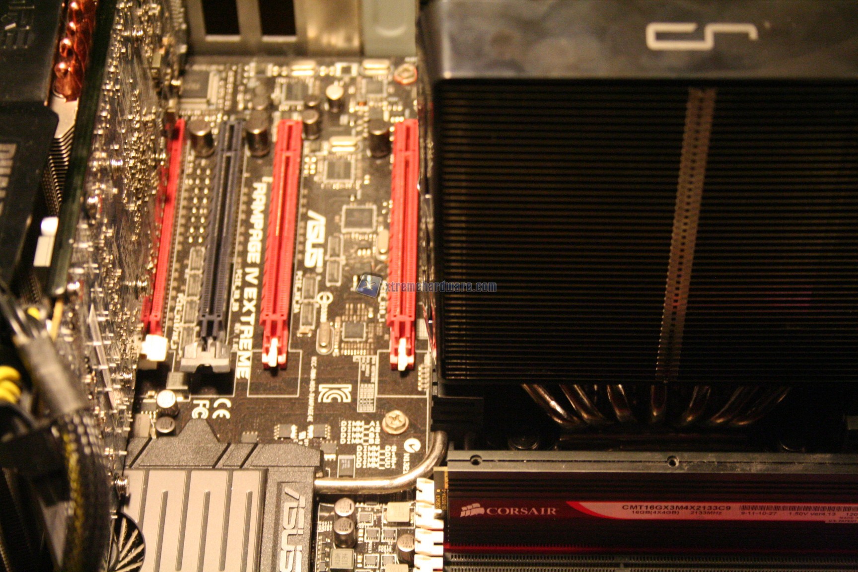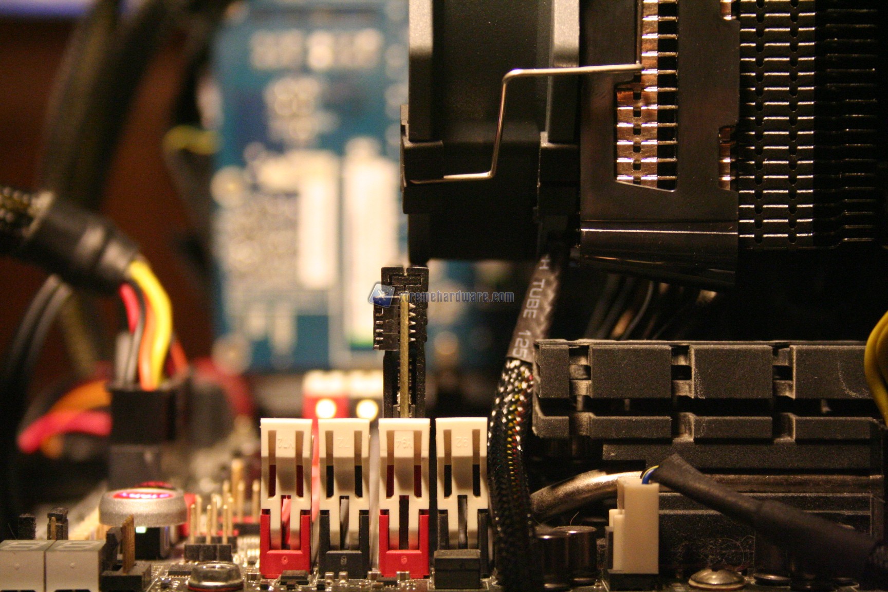 La compatibilità con RAM ad elevato profilo purtroppo con piattaforme 2011, grazie allo spessore standard della ventola frontale da 25mm, è bassa. Per dissipatori a doppia torre però dobbiamo ammettere che abbiamo visto di peggio.