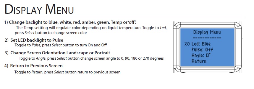 Il menù Display invece ci permette di scegliere il colore dell'illuminazione del display tra blu, bianco, rosso, ambra, verde, viola e perfino spegnerlo, selezionare anche la modalità Pulse, permettere ancora di impostare la modalità landscape o portrait.