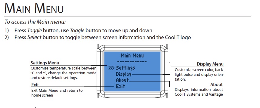CoolIT A.L.C. Vantage: Kit liquido alla portata di tutti - Funzionamento del Menù Interno