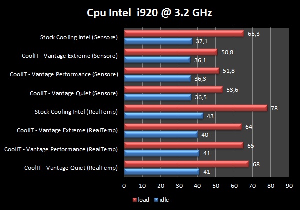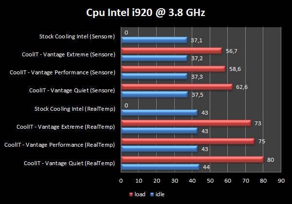 Come possiamo osservare le differenze in termini di temperature sono piuttosto notevoli, e il kit di CoolIT fa senza dubbio il suo dovere, partiamo selezionando la ventola al minimo (Quiet) ed una differenza in Full Load di circa 6° fino a circa 9° impostando la ventola al massimo (Extreme). Arriviamo a circa 15° di differenza tra il dissipatore Stock Intel rispetto alle impostazioni Extreme quando portiamo la cpu a 3.2 GHz. Non ci è stato possibile terminare con successo i test a 3.8 GHz con il dissipatore Intel in quanto le temperature elevate hanno fatto andare in Crash in nostro sistema. Aggiungiamo anche se i test con frequenza cpu a 4 GHz, non ci ha permesso di renderla perfettamente stabile, cosa che invece era stato possibile con altri dissipatori di alta gamma.