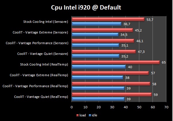 Come descritto nella pagina relativa al sistema di prova, abbiamo usato per mettere sotto stress la nostra cpu l'ottimo software Stress Test Prime95 in versione a 64bit, ed siamo andati a misurare i valori di temperature con il nostro sensore ed in più riportando i valori di RealTemp, potete vedere i risultati comparati rispetto al dissipatore Intel in dotazione.