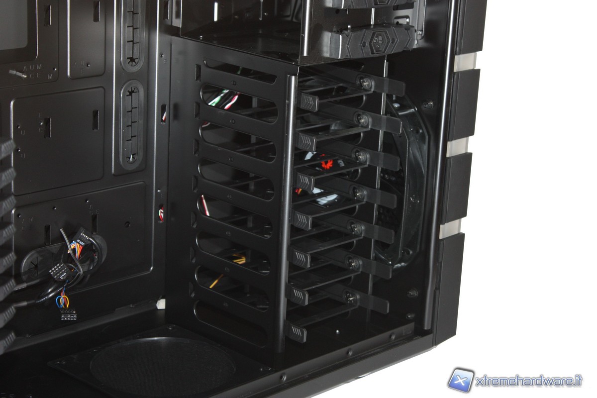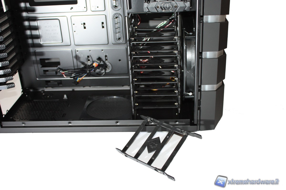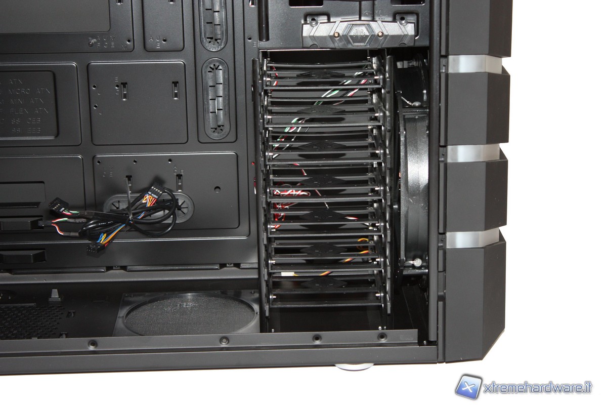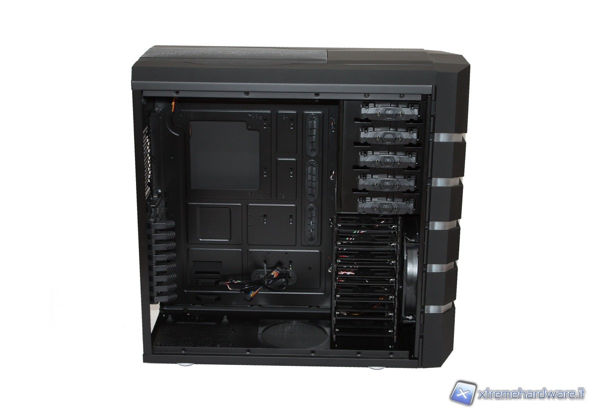 Passando ora agli interni, non possiamo non notare l'incredibile spazio e il grande numero di periferiche installabili. Potremo infatti inserire ben 7 HD, comodamente nei loro bay "tool-less", senza l'utilizzo di alcun cacciavite grazie a delle semplici "slitte"; altrettanto potremo fare con i 5 slot da 5,25" dotati di un comodo dispositivo di aggancio. Il raffreddamento dei dischi rigidi, come detto in precedenza, sarà affidato all'enorme ventola da 230mm posizionata nel frontale.