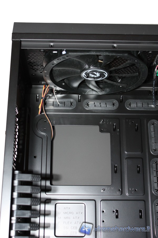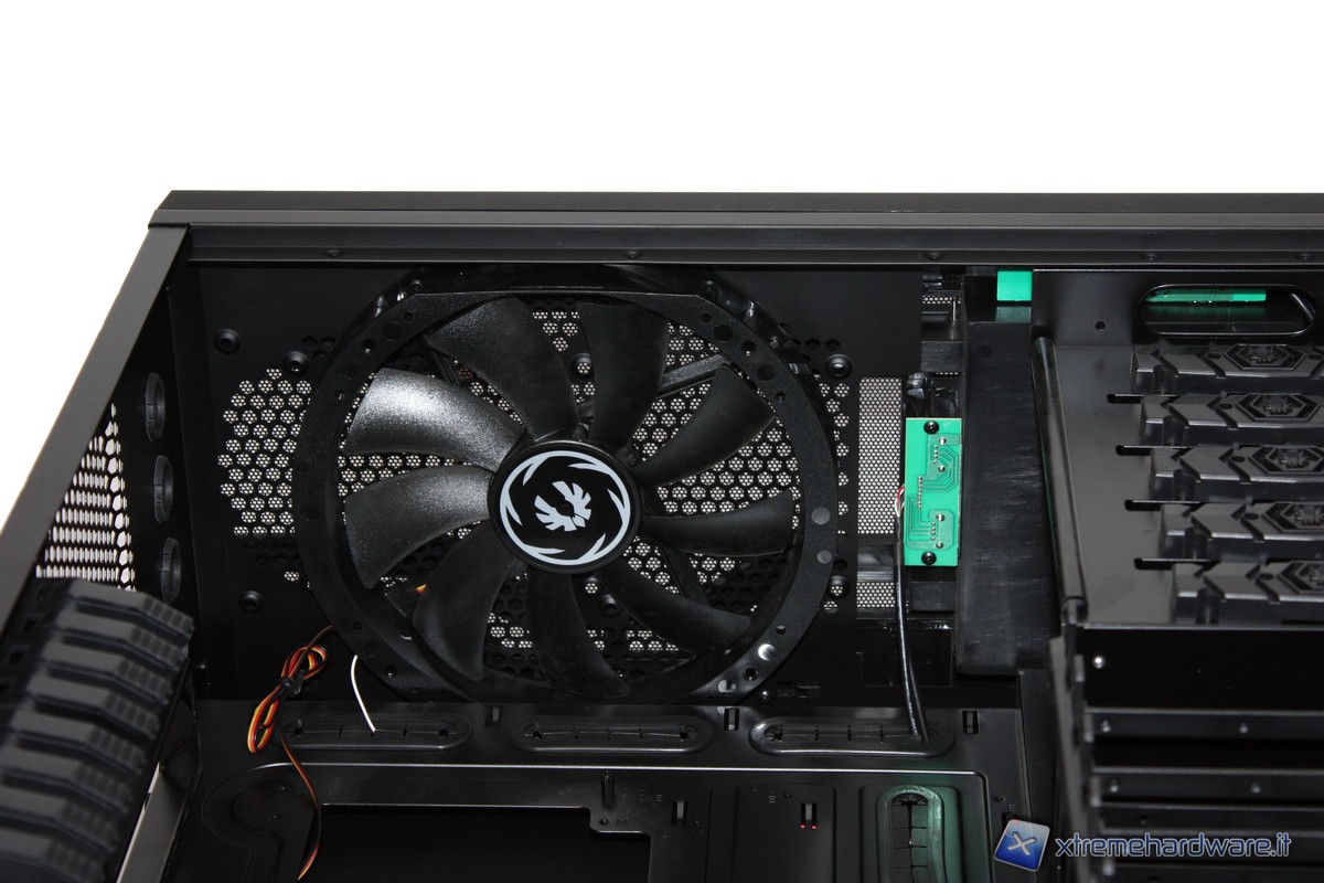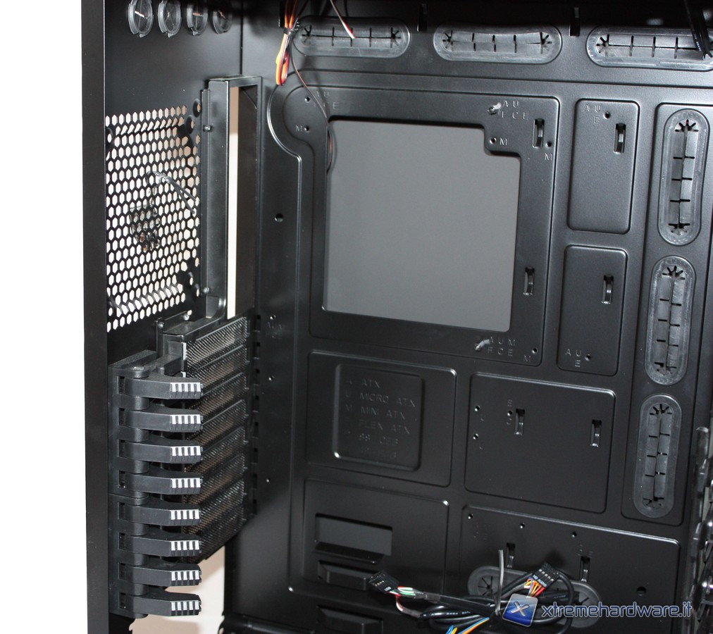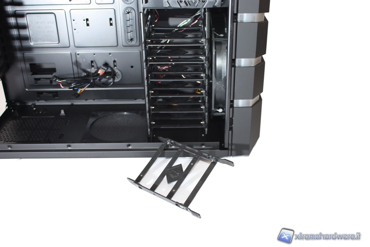 Passando ora agli interni, non possiamo non notare l'incredibile spazio e il grande numero di periferiche installabili. Potremo infatti inserire ben 7 HD, comodamente nei loro bay "tool-less", senza l'utilizzo di alcun cacciavite grazie a delle semplici "slitte"; altrettanto potremo fare con i 5 slot da 5,25" dotati di un comodo dispositivo di aggancio. Il raffreddamento dei dischi rigidi, come detto in precedenza, sarà affidato all'enorme ventola da 230mm posizionata nel frontale.