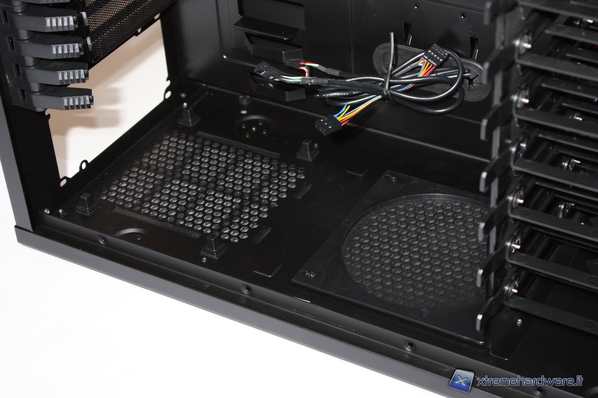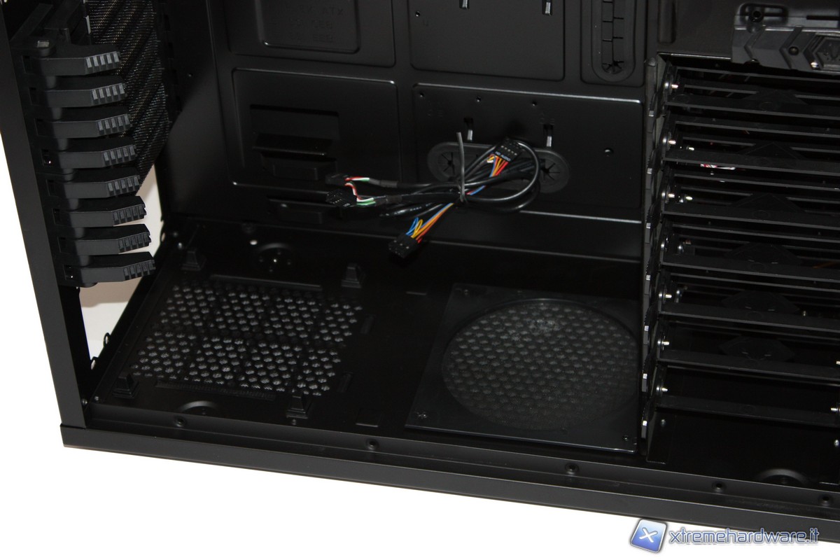Nella parte posteriore le periferiche saranno tenute ferme da dei comodi "pistoncini" in grado anche qui di evitare l'utilizzo di alcuna vite, mentre invece la parte inferiore, dedicata al posizionamento dell'alimentatore, è provvista di due filtri antipolvere, uno dedicato al PSU (rimuovibile dall'esterno per una comoda manutenzione di pulizia), l'altro all'eventuale inserimento di una ventola in immissione da 140mm.