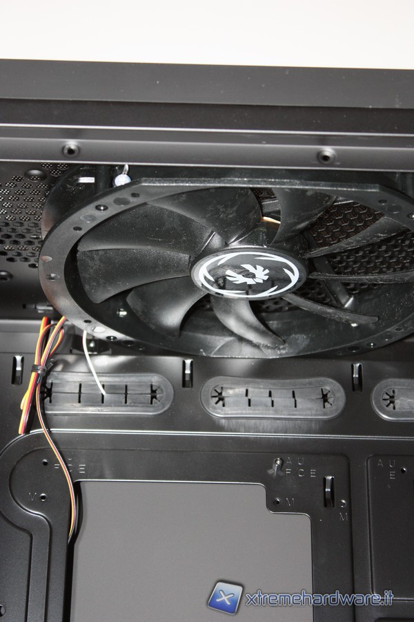 Nella zona superiore, come anticipato prima, troviamo una ventola in estrazione da 230mm dotata di led rosso, che può anche esser sostituita da un radiatore nel caso in cui si volesse installare un impianto a liquido.