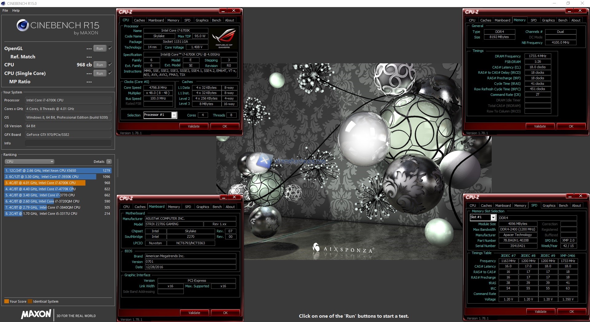 Per le classiche prove di overclock manuale ci siamo basati sul raggiungimento di una frequenza stabile nel rapporto tipologia di dissipazione (in questo caso un AIO da 240mm) e temperature. Per testare la stabilità della scheda madre ci siamo serviti anche qui del software Cinebench R15 utilizzato anche per i test a default al fine di trovare una buona stabilità per un eventuale Daily-Use. Teniamo a precisare che la CPU utilizzata un i7-6700K ha una frequenza base di 4.0GHz e con Turbo attivo di 4.2GHz 4c/8t quindi ci siamo limitati a salire ancora di diversi MHz per trovare il giusto equilibrio come detto poc’anzi. Le RAM utilizzate come abbiamo visto sono un kit da 8GB con frequenza di 3466MHz impostate tramite BIOS con il profilo XMP in modo tale da non creare instabilità durante la fase di overclock della sola CPU. Il software Cinebench R15 lo abbiamo eseguito anche questa volta in modalità Multithreading in modo tale che ogni singolo Core venisse impiegato nel calcolo del rendering di poligoni.